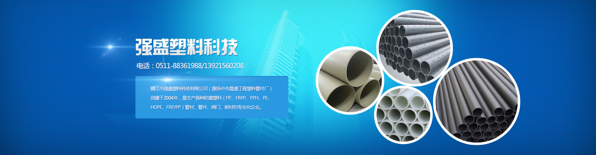 鎮(zhèn)江市強(qiáng)盛塑料科技有限公司(原揚(yáng)中市昌盛工程塑料管件廠)創(chuàng)建于2004年,是生產(chǎn)各種防腐塑料(PP、FRPP、PPH、PE、HDPE、FRP/PP)管材、管件、閥門(mén)、板材的專(zhuān)業(yè)化企業(yè)。公司擁有各類(lèi)先進(jìn)生產(chǎn)設(shè)備,固定資產(chǎn)約3800萬(wàn)元,可生產(chǎn)管材、管件口徑為Φ15-Φ1200mm,產(chǎn)品規(guī)格齊全。目前產(chǎn)品廣泛適用于醫(yī)藥、食品、冶金、造紙、電力、礦山、城市污水處理、垃圾填埋、輕工紡織等領(lǐng)域,暢銷(xiāo)全國(guó)各省市自治區(qū),遠(yuǎn)銷(xiāo)二十多個(gè)國(guó)家及地區(qū)。